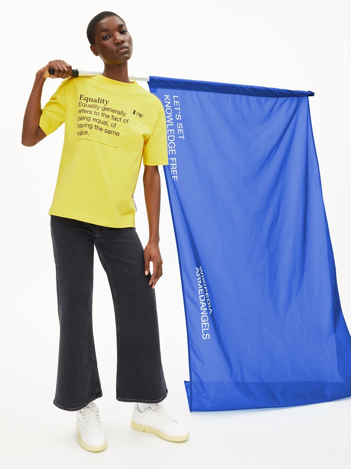 From slogans like “let’s set knowledge free” and “for fact’s sake” emblazoned across tees, sweatshirts and baseball hats, to printed definitions of words like “equality”, the Wikipedia x Armedangels capsule homes in on the dangers of misinformation as well as the importance of easily accessible, free and reliable facts – which is especially relevant in a time where a reliance on AI can lead to inaccuracies that may go unchecked by readers.